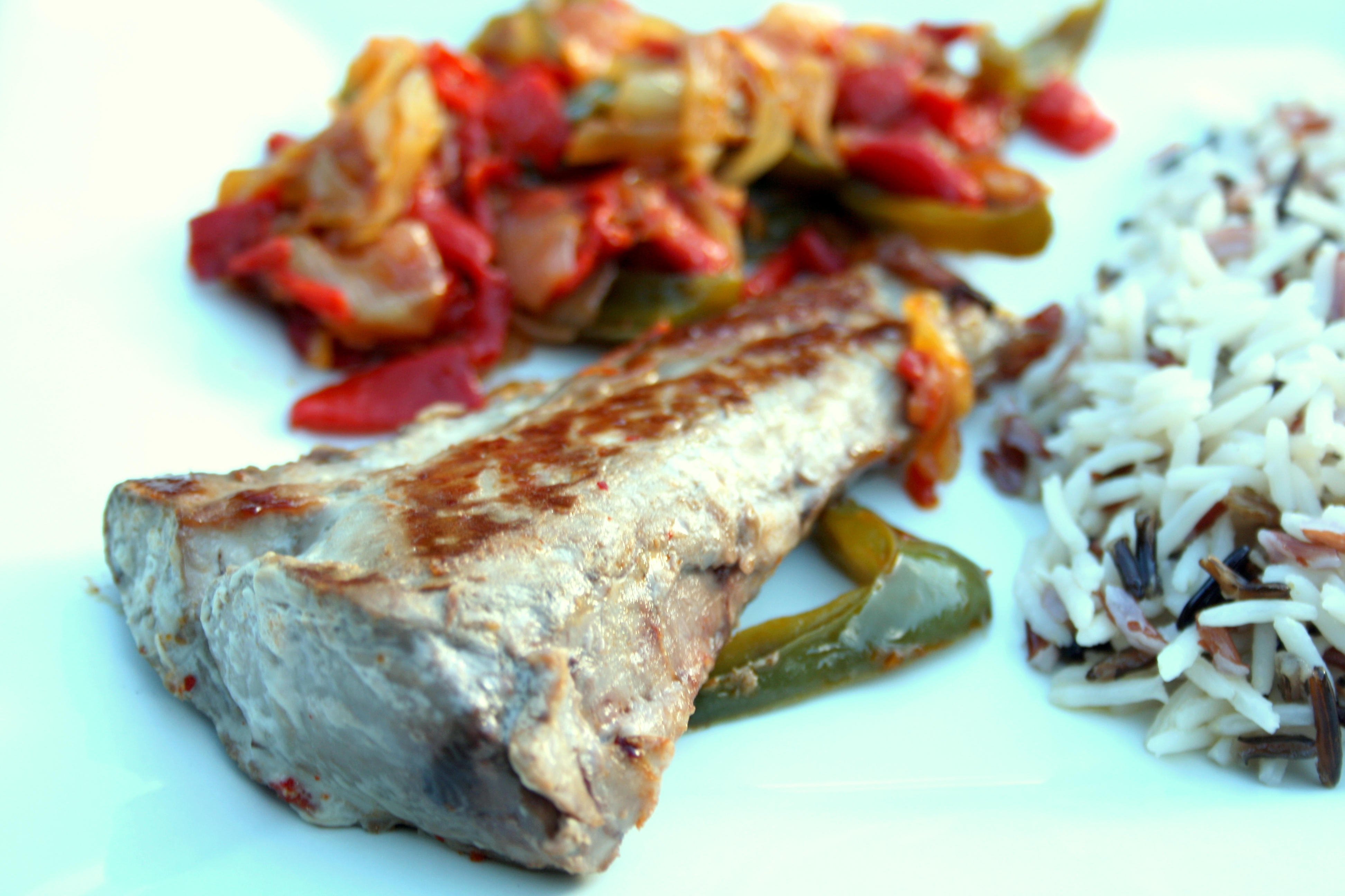 Mettre de côté la mijotée oignon/poivron/piquillos, et faire revenir le thon dans la même poêle (rajouter un peu d’huile d’olive si besoin est). Le temps de cuisson va dépendre de l’épaisseur soit de la ventrèche soit de la darne. Dans le cas présent, j’ai compté 5 bonnes minutes de chaque côté, le thon doit rester tendre.