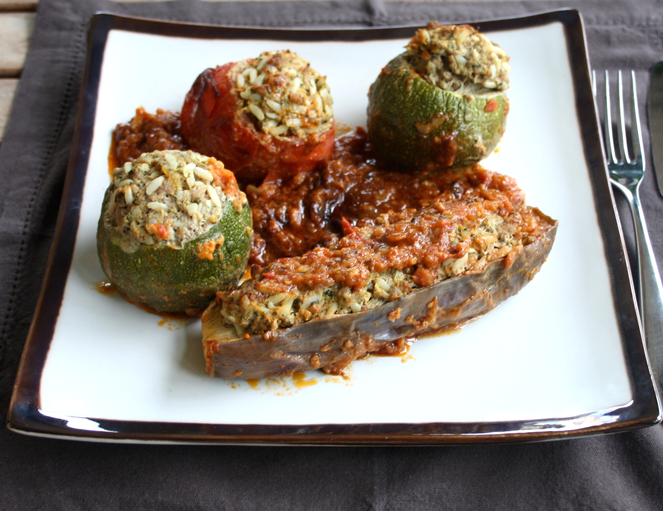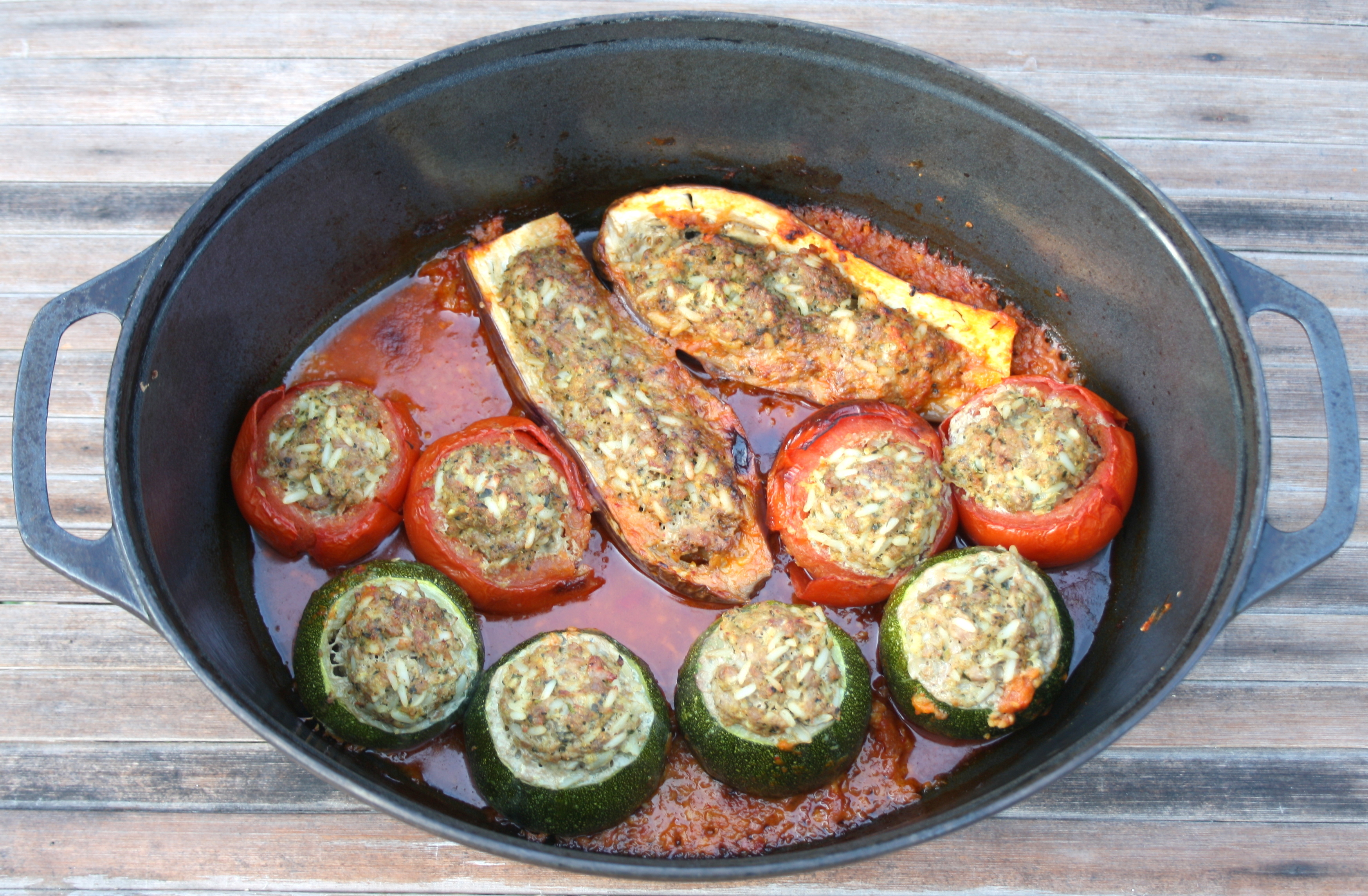 Garnir tous les légumes de farce, et les déposer dans une cocotte. Verser la sauce tout autour des légumes et faire cuire à feu moyen à couvert environ 30 minutes. Vérifier que les légumes soient bien cuits.