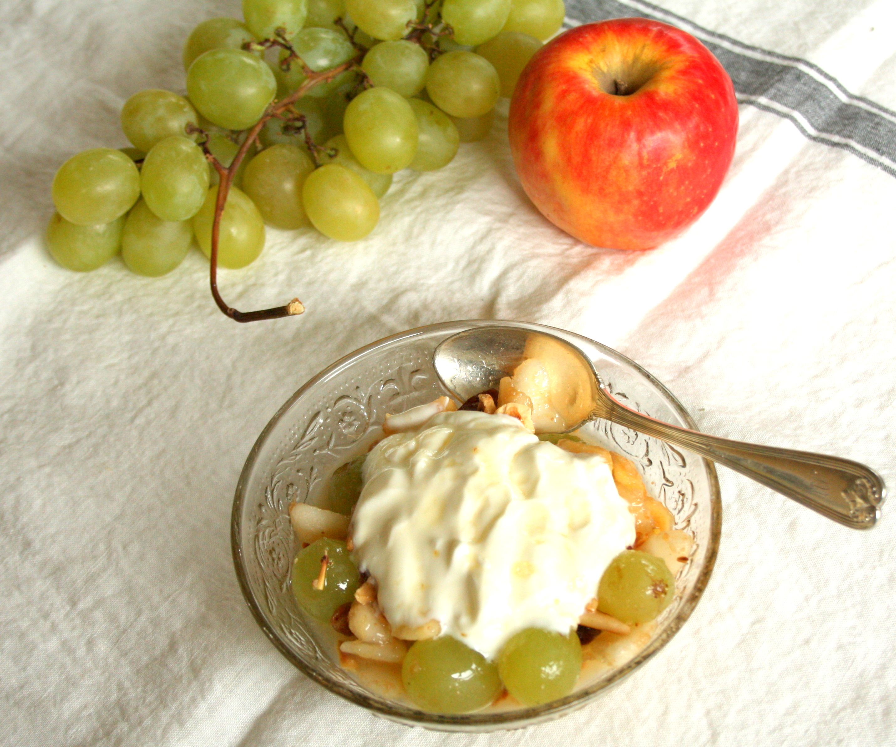 Voilà une petite salade de fruits très fraîche et bien de saison où pommes, poires et raisins font bon ménage !! On y rajoute quelques noisettes et pignons torréfiés pour le croquant, sans oublier la touche de douceur avec le yaourt grec et le sirop de miel. Bref, un dessert très automnal !!