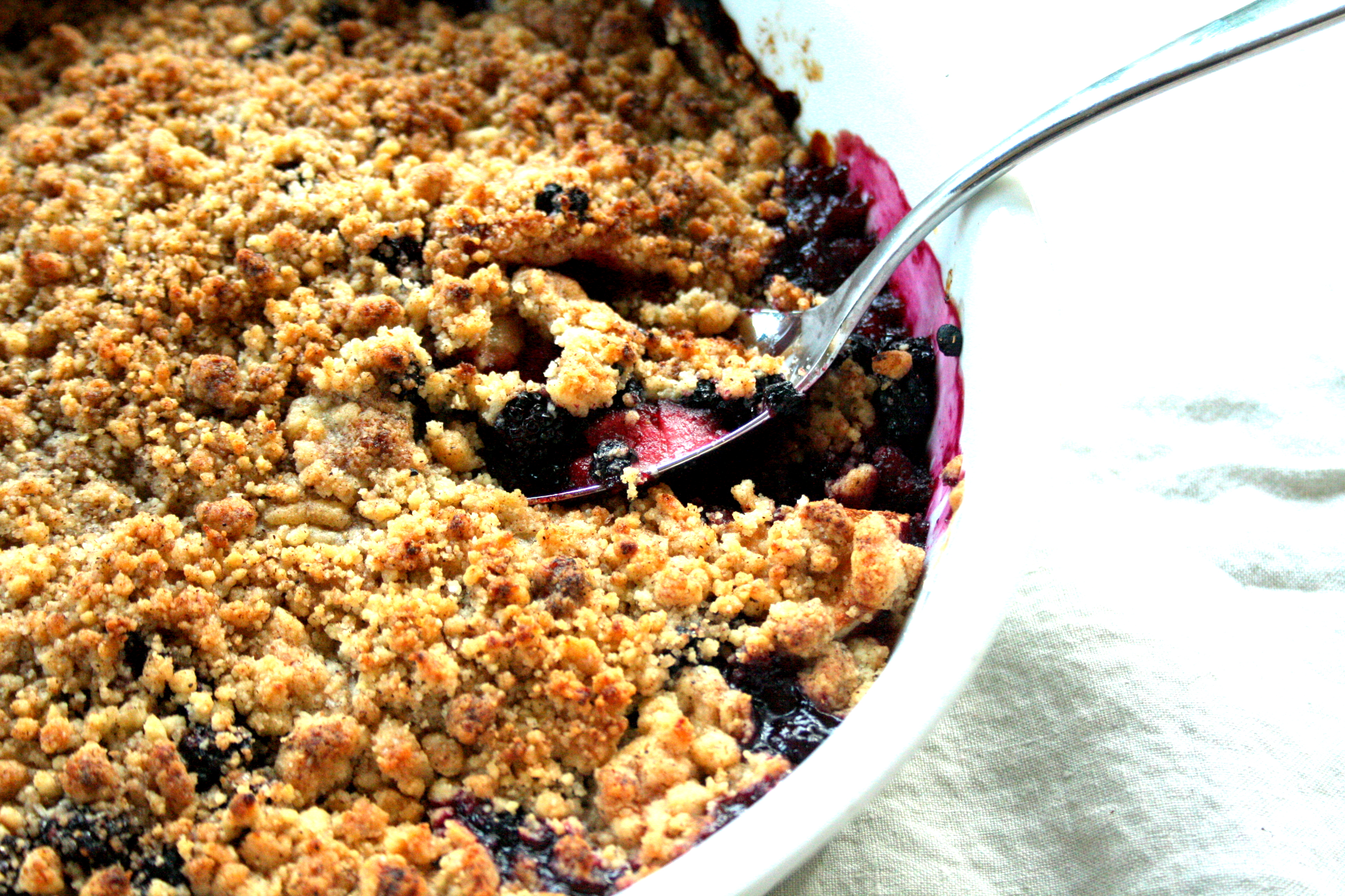 Répartir le mélange sur les fruits puis enfourner pendant 30 à 35 minutes. Servir tiède, avec, si l’on veut, une boule de glace à la vanille.