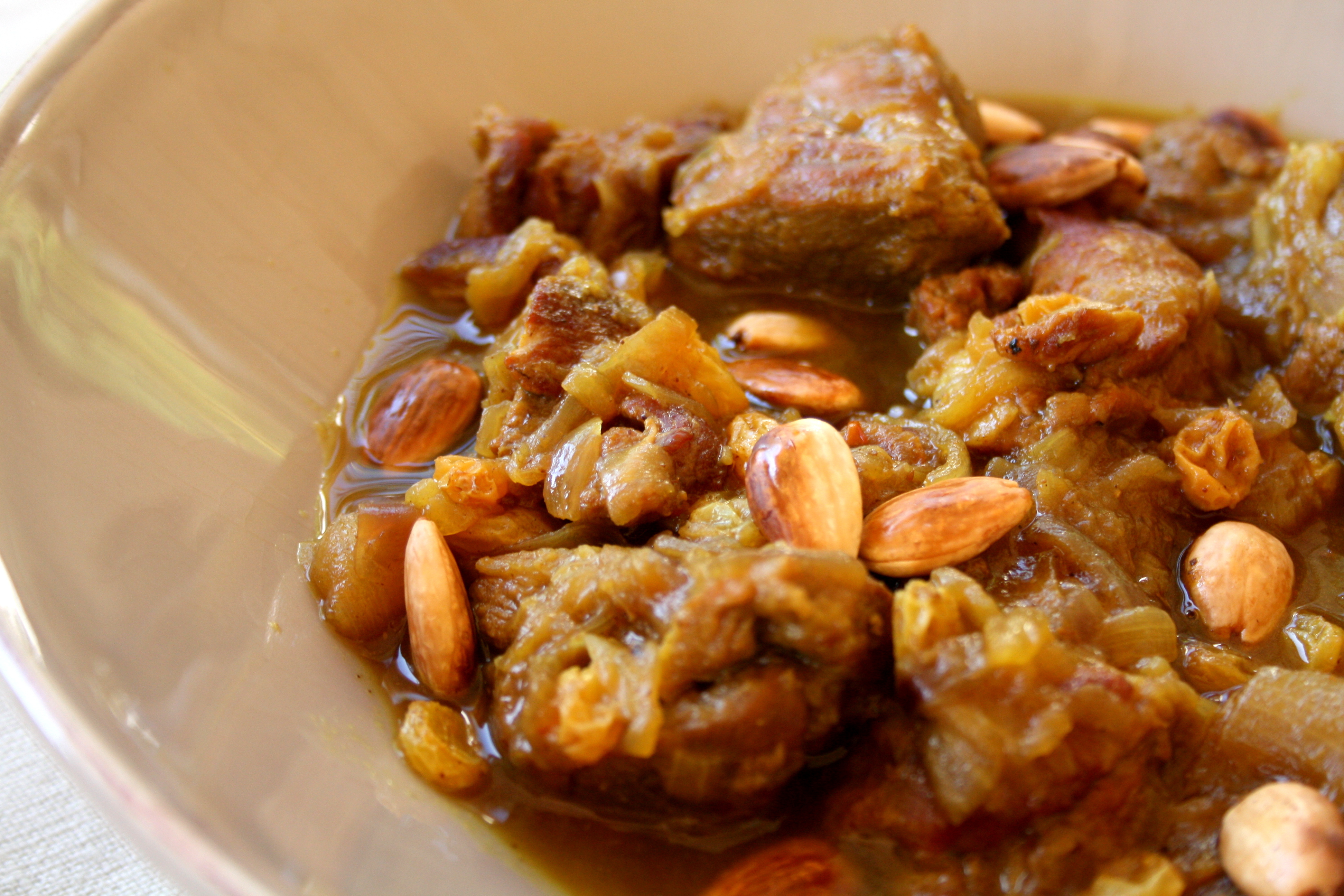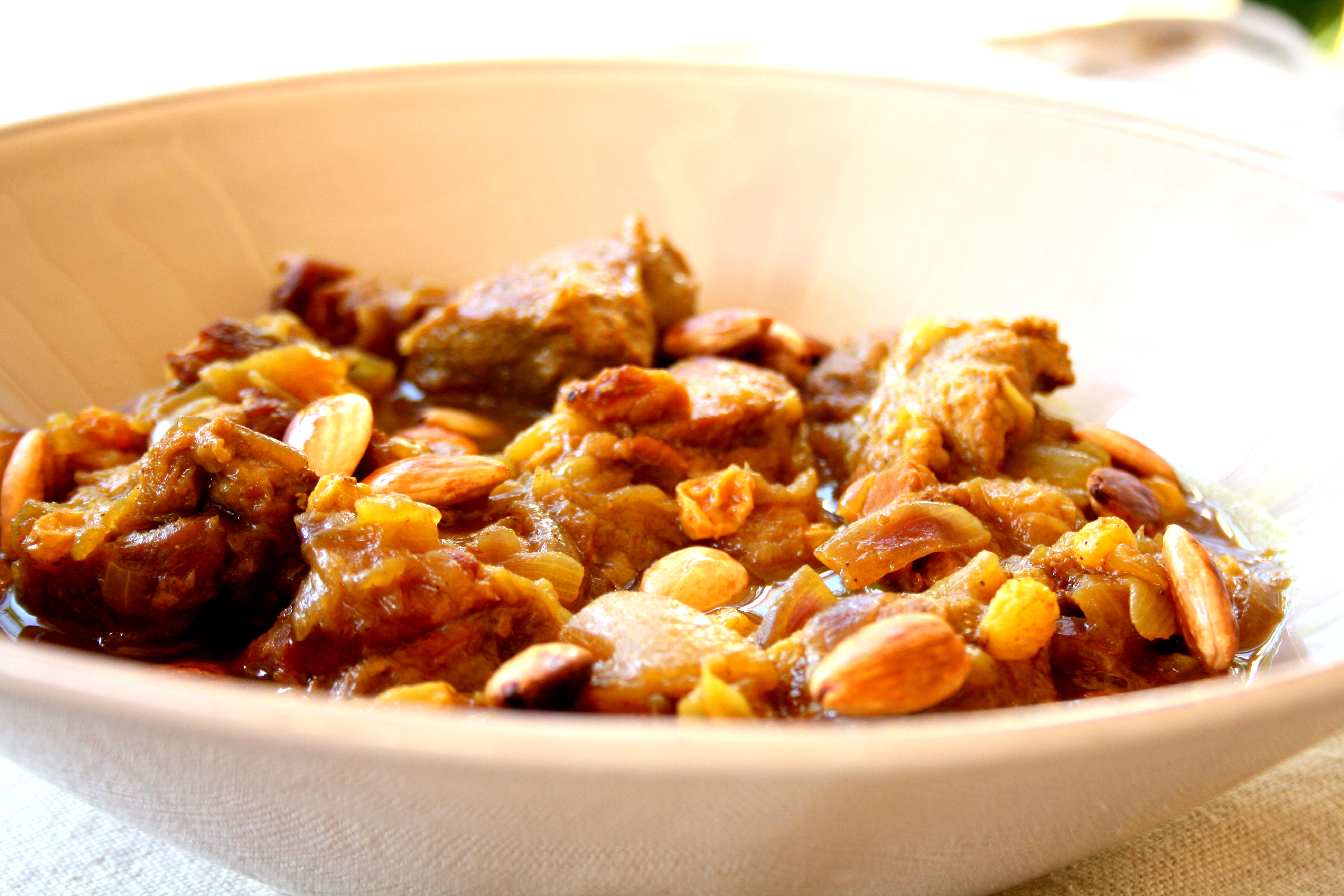 Après le tajine de poisson, en voici un très différent qui associe agneau, oignons, amandes et raisins secs. Il est très goûteux, très parfumé et légèrement salé sucré. L’alliance des saveurs en fait un plat qui je pense titillera vos papilles avec un petit goût de « revenez-y » !! Alors laissez-vous tenter !!