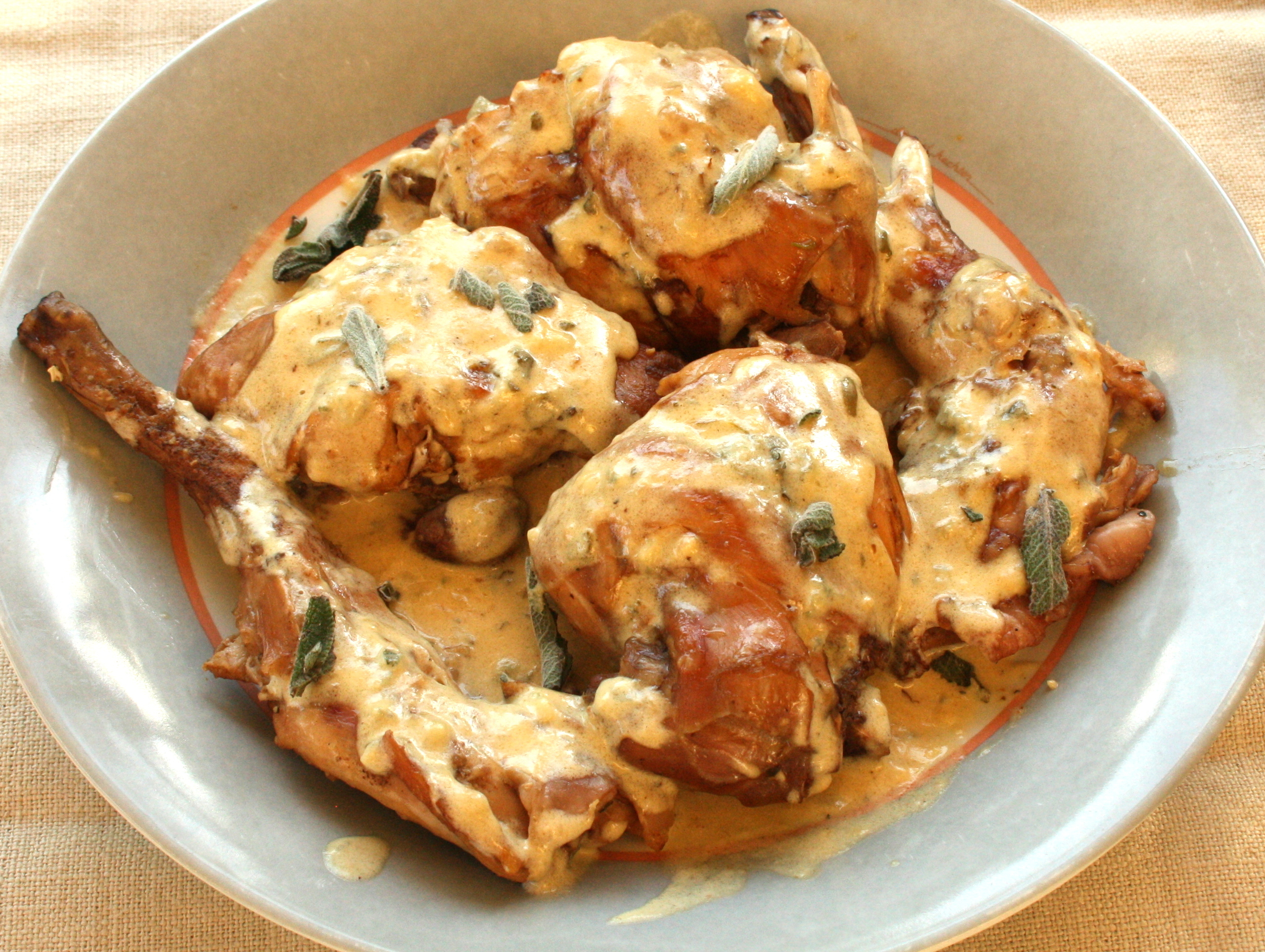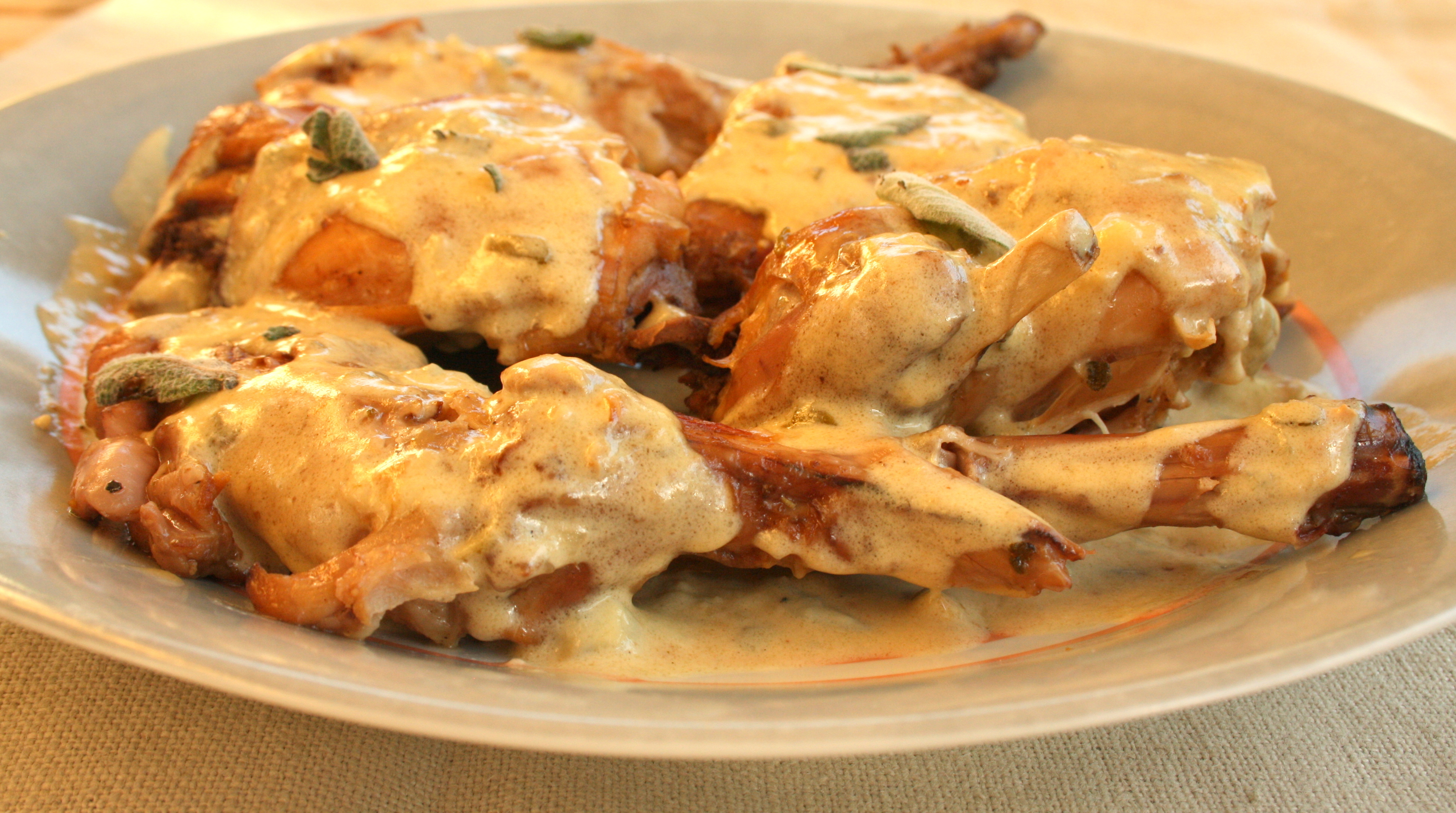 Quand j’ai fait cette recette la première fois, j’ai eu peur que la sauce au gorgonzola ne l’emporte sur le goût du lapin. Et bien non, le gorgonzola est bien plus doux que notre roquefort national !! Et c’est au contraire une sauce tout en onctuosité et en légèreté qui se marie à merveille avec le lapin et le goût assez puissant de la sauge. Des fettuccini fraîches pour accompagner le tout, et à table !!