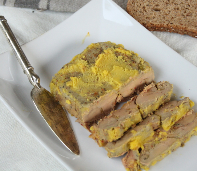 Sortir ensuite le foie du plat et le déposer dans une terrine. Filtrer la graisse rendue et la verser par dessus. Recouvrir d’un film plastique, mettre un poids pour tasser, et au frais pour au minimum 24 heures.