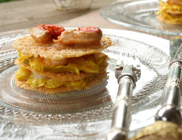 Voilà une entrée dont le mélange poireaux, saint-jacques et tuiles au parmesan est tout simplement superbe, en plus d’être rapide et facile à réaliser !! Les tuiles sont préparées à l’avance, la fondue de poireaux idem (on la réchauffera au moment du montage), il n’y a que les saint-jacques à poêler au dernier moment. Une petite entrée festive, légère et fort goûteuse !!