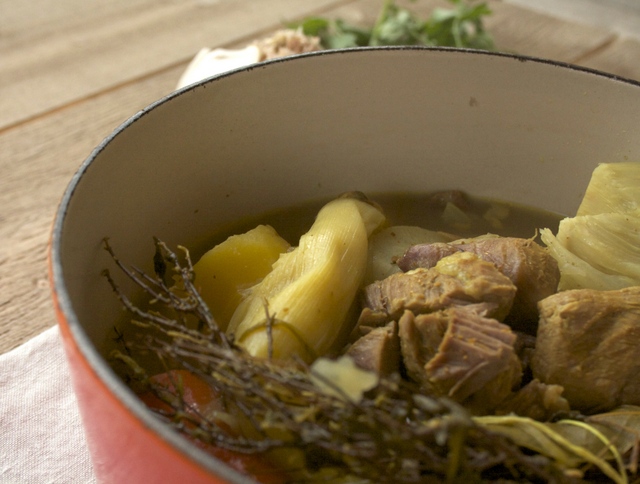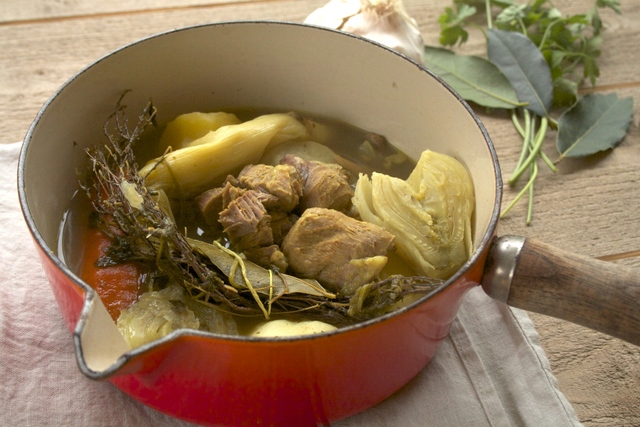 A la fin de la cuisson, récupérer la tête d’ail, enlever la peau et mélanger la pulpe avec 4 cuillerées à soupe de bouillon. Servir avec le pot-au-feu.