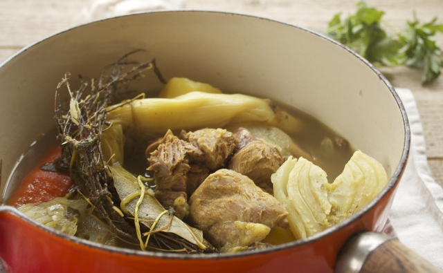 Pendant ce temps, peler les légumes, les laver. Couper les fenouils en deux. Ajouter tous les légumes dans le faitout mis à part les fenouils, sans oublier la tête d’ail entière non épluchée. Poursuivre la cuisson pendant 1 heure. Rajouter le fenouil après 1/2 heure de cuisson.