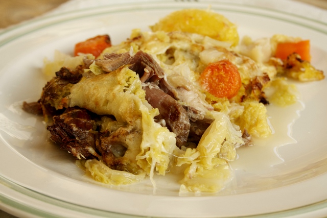Transvaser les légumes et le canard dans un plat à four à l’aide d’une écumoire, puis rajouter une petite louche de bouillon. Recouvrir du fromage râpé et enfourner pour environ 15 minutes. Le plat doit être bien gratiné.