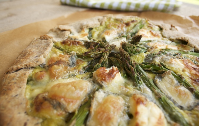 Etaler la pâte en rond sur une feuille de papier sulfurisé. La recouvrir de crème d’asperges jusqu’à environ 3 centimètres du bord de la pâte. Déposer ensuite les pointes d’asperges sur la crème, ainsi que le chèvre coupé en rondelles. Rabattre les bords de pâte vers le centre.