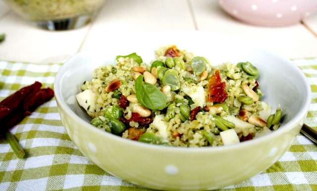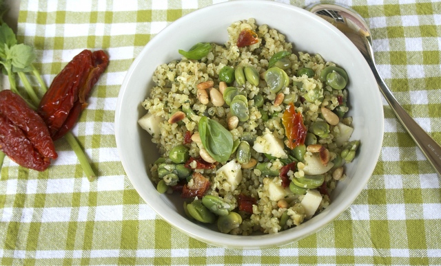 Quand le boulgour a refroidi, le verser dans un saladier et y ajouter 2 cuillères à soupe d’huile d’olive. Bien mélanger, puis ajouter le pesto, les tomates séchées, le fromage, les petits pois et les fèves. Mélanger délicatement.