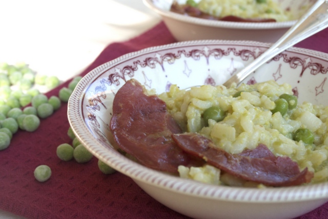 Il me restait des petits pois après mon taboulé printanier, j’ai toujours tendance à acheter plus qu’il n’en faut !! D’où l’idée d’un risotto, je n’en fais pas très souvent. Et qui dit risotto dit Italie … Pour la petite histoire, le risi e bisi est originaire de la Vénétie, et était offert au doge de Venise en avril le jour de la Saint-Marc. Et ayant d’excellents souvenirs de mon séjour à Venise, ce risotto me disait bien. Je lui ai rajouté des chips de coppa, qui se sont parfaitement accordés avec la douceur du petit pois et le parmesan.