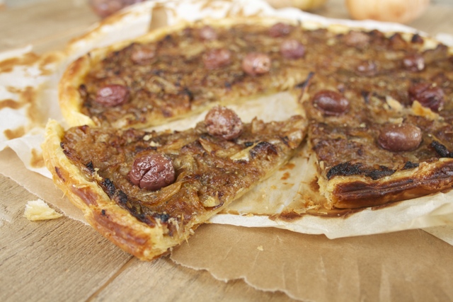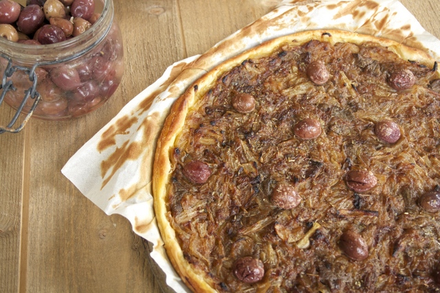 Sortir la pâte, étaler la garniture, poser les olives puis parsemer d’origan. Enfourner pour 20 à 25 minutes. Elle doit être bien dorée. On peut la servir chaude en entrée avec un mesclun, ou froide en apéritif.