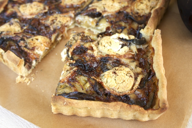 Etaler la pâte dans le moule. Trancher finement le fromage de chèvre. Recouvrir la pâte d’une couche de fromage, disposer ensuite l’ensemble oignon/aubergine, puis à nouveau une couche de fromage. Parsemer le thym sur le dessus.