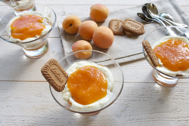 Procéder au montage. Dans le fond de chaque verrine, déposer une cuillère à soupe de coulis d’abricot, puis une couche de crème, ensuite un abricot (soit 4 morceaux) caramélisé et un biscuit spéculoos émietté. Recouvrir d’une seconde couche de crème et enfin du reste de coulis.
