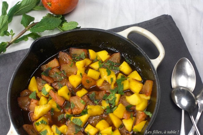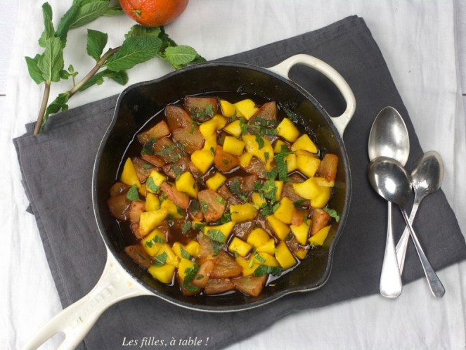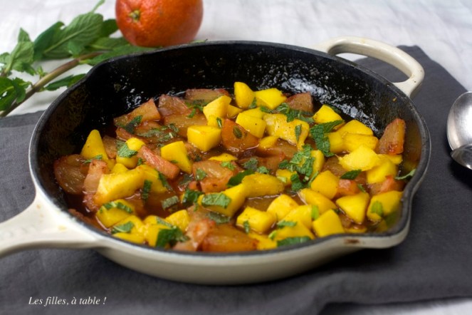 Je viens d’acheter mes premières fraises, mais en ce dernier jour de mars, je préfère vous proposer cette petite poêlée d’ananas et mangue fraîche, c’est un régal !! J’ai fait revenir l’ananas avec un peu de rhum et de jus d’agrumes, une petite touche de miel pour adoucir le tout, mon ananas étant très sucré, j’en ai mis très peu. La mangue et la menthe sont venus rafraîchir le tout, encore une fois ce fut délicieux 😋, d’où le partage.