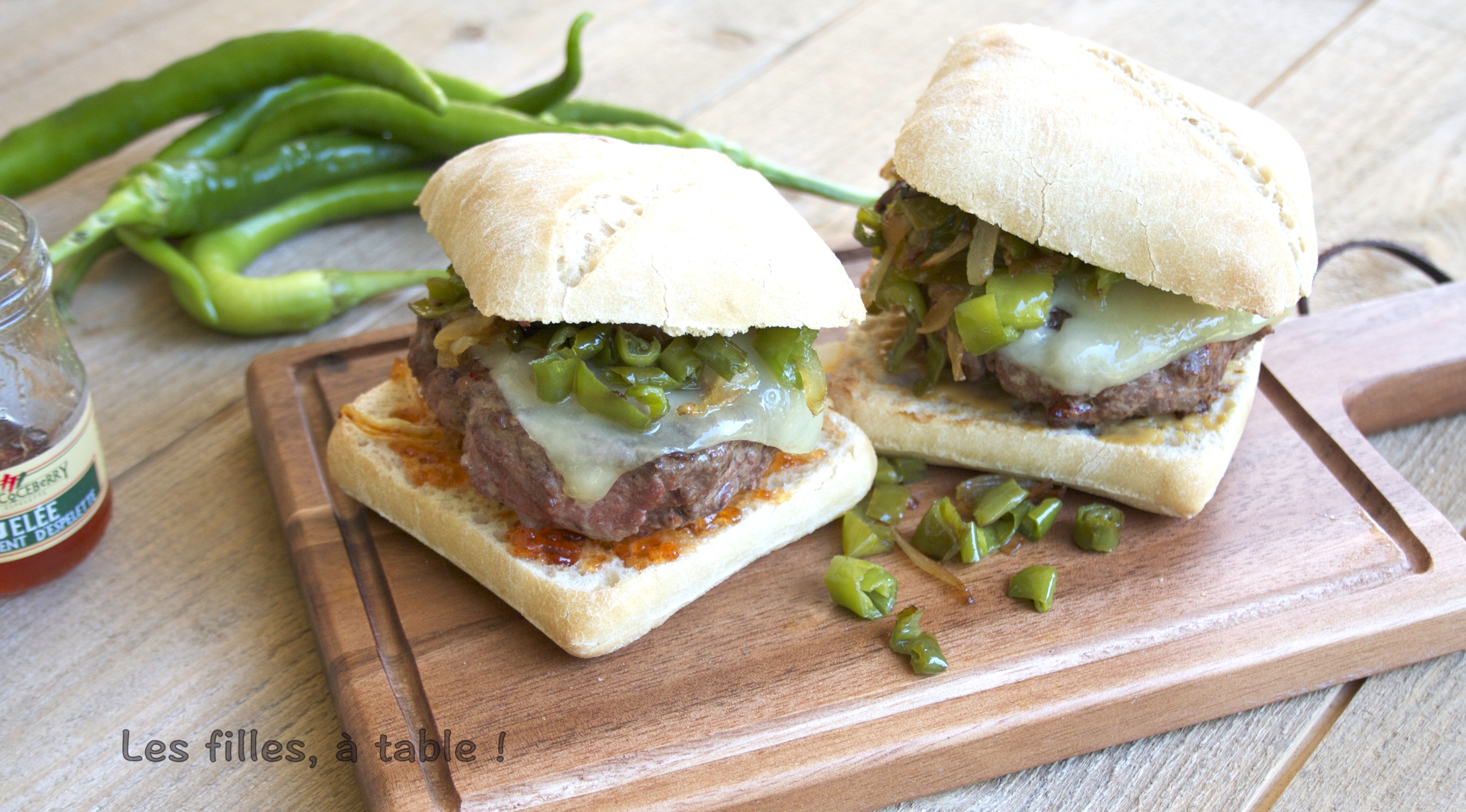 J’ai donc décidé de proposer ce qui représente à mes yeux un petit plaisir régressif et bien réconfortant, un hamburger … Mais pas n’importe lequel !! Habitant à la limite de deux départements connus pour leurs bons produits, j’ai associé la canard des Landes aux piments doux du Pays Basque, un produit de saison que j’adore, et au piment d’espelette bien sûr …. Je dois avouer qu’ils ont vite été engloutis !!