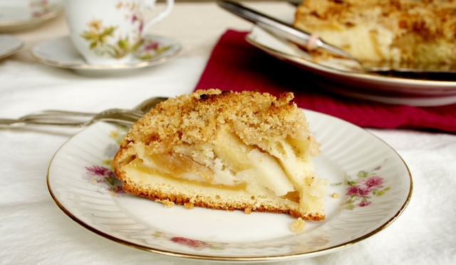 Et un dessert aux pommes de plus, mais j’adore les pommes cuites, que ce soit en compote ou en gâteau !! Celui-ci est bien gourmand, avec son crumble au léger goût de cannelle recouvrant des pommes très moelleuses. Il se suffit ainsi à lui-même, mais on peut le servir également avec une bonne crème fouettée, une boule de glace vanille ou une crème anglaise pour plus de gourmandise ….